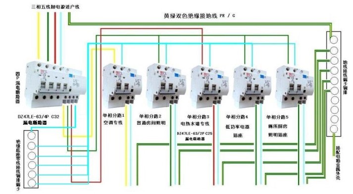 三相五线制标准导线颜色为:A相线黄色,B相线绿色,C相线红色,中性线N淡蓝色,地线PE黄绿色。